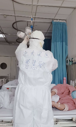 深圳醫(yī)療隊(duì)隊(duì)員曹慧敏在為患者服務(wù)。為了方便在“艙室”內(nèi)互相辨識,醫(yī)護(hù)人員都在自己的衣服上用記號筆寫上了名字。