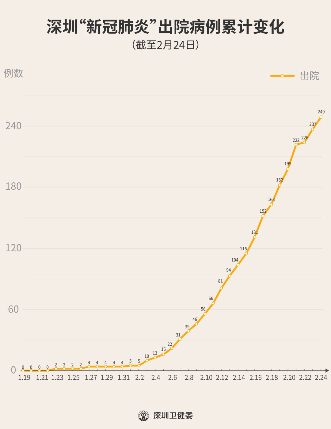 2月24日下午,經(jīng)專家組會(huì)診,深圳有12名新型冠狀病毒肺炎確診患者出院,累計(jì)達(dá)249人,連續(xù)22天有人出院。