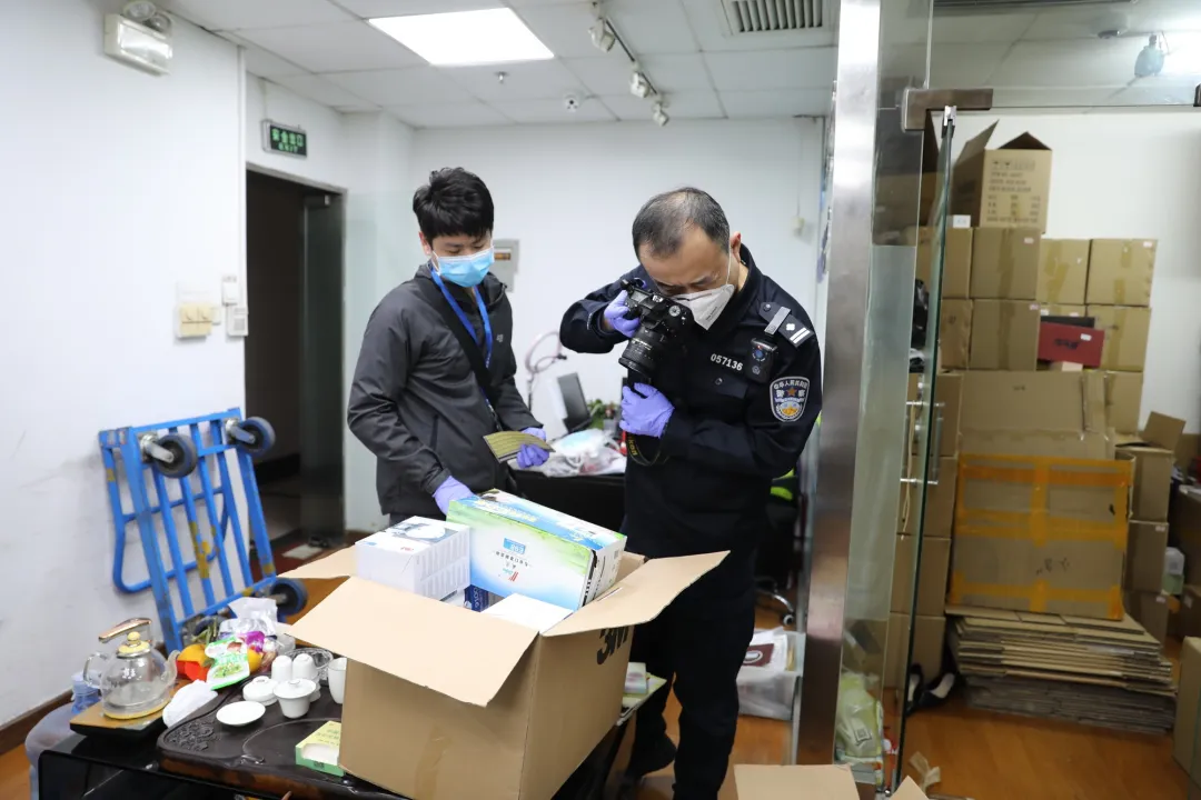 (刑警大隊(duì)民警對查獲的偽劣口罩拍照取證)