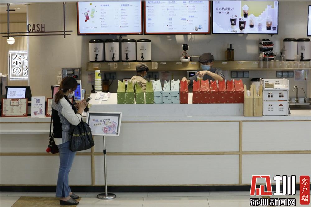 一個飲品店前,等待取餐的市民以及店員都有佩戴口罩。