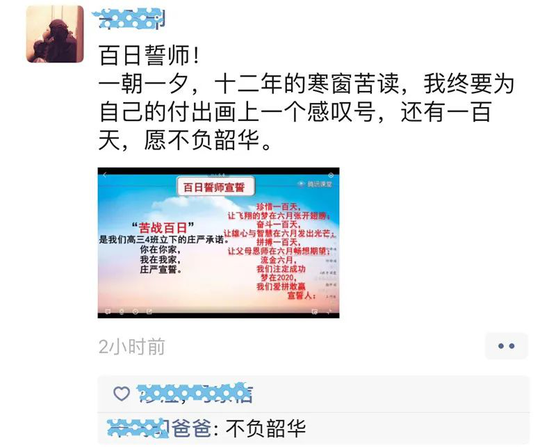 “生于非典,考于新冠,2020,我們注定不凡!疫情當(dāng)前,雖然我們隔離在家,不能像往屆那樣,齊聚學(xué)校體育館舉行誓師大會,意氣風(fēng)發(fā)地走進(jìn)學(xué)校精心準(zhǔn)備的“成功門”,伴隨奮進(jìn)的樂聲高喊出我們的誓言,在“簽名紀(jì)念墻”上寫下對未來的期盼。但即使相隔網(wǎng)絡(luò)兩端,我們依然有老師祝福和引導(dǎo),有家長的鼓勵和支持,有同窗的幫助和陪伴,高考百日,我們?nèi)栽谝黄鹫癖鄹吆簦?020高考,我們準(zhǔn)備好了?!?/p>