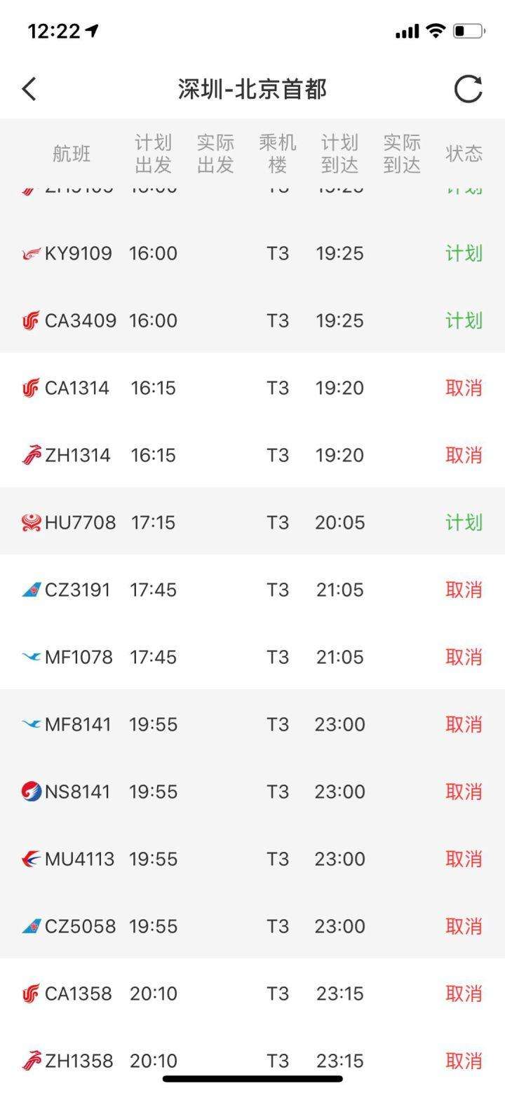 不僅是深圳飛往杭州的CA1736航班,記者發(fā)現(xiàn),今晚深圳飛往北京、上海、南京等國(guó)內(nèi)多個(gè)城市的航班,均顯示為取消狀態(tài)。而原計(jì)劃17:45由深圳飛往杭州的CA1734和原計(jì)劃22:05由深圳飛往杭州的MF8384航班,均顯示為取消狀態(tài)。