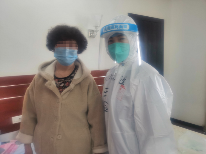 ▲深圳醫(yī)療隊員王玲與張金秀(化名)在隔離點合影。