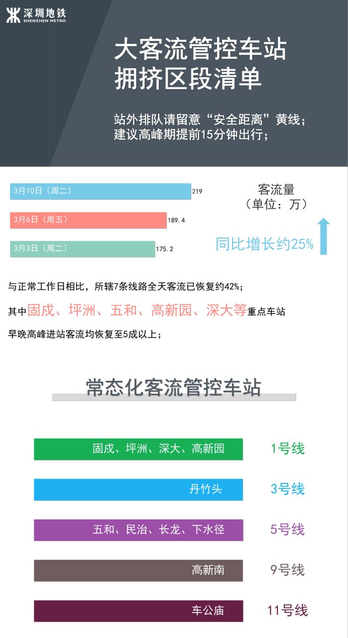 3月10日(周二),深圳地鐵所轄7條線(xiàn)路客流量已達(dá)219萬(wàn)人次,為防止客流激增而造成乘客過(guò)度擁擠,深圳地鐵已在11座大客流站點(diǎn),實(shí)行常態(tài)化客流管控。另外有17座重點(diǎn)車(chē)站,也將視客流情況隨時(shí)采取客流管控措施。