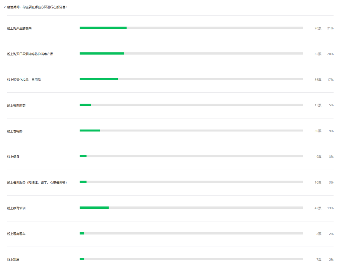雖然有56%的市民表示對“在線消費”的商品質(zhì)量和服務評價滿意度下降,但是市民的原有生活習慣卻在潛移默化中改變了,超一半的市民表示喜歡“在線消費”,疫情結束后,會提高“在線消費”在日常開銷中的比例。特別是會加強生鮮蔬菜、口罩酒精、化妝日用品的購買頻率,也會更常使用網(wǎng)絡進行教育培訓、就醫(yī)購藥、法律咨詢、看房看車等。