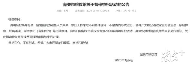 韶關(guān)、肇慶等地發(fā)出倡議書,疫情期間,堅(jiān)持少出門、不串門、不聚會(huì)、戴口罩、勤洗手,倡導(dǎo)通過家庭分散追思、網(wǎng)絡(luò)祭祀、家庭悼念等形式祭拜,不現(xiàn)場祭拜、不踏青祭拜。