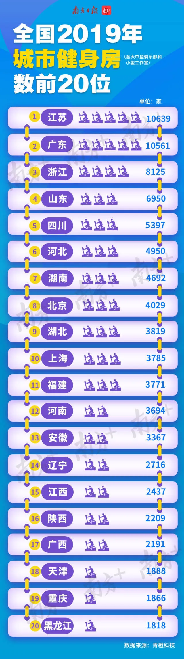 其中江蘇10639家位列第一,廣東10561家排名第二。這個數(shù)據(jù)充分說明廣東在體育健身領(lǐng)域走在前列。