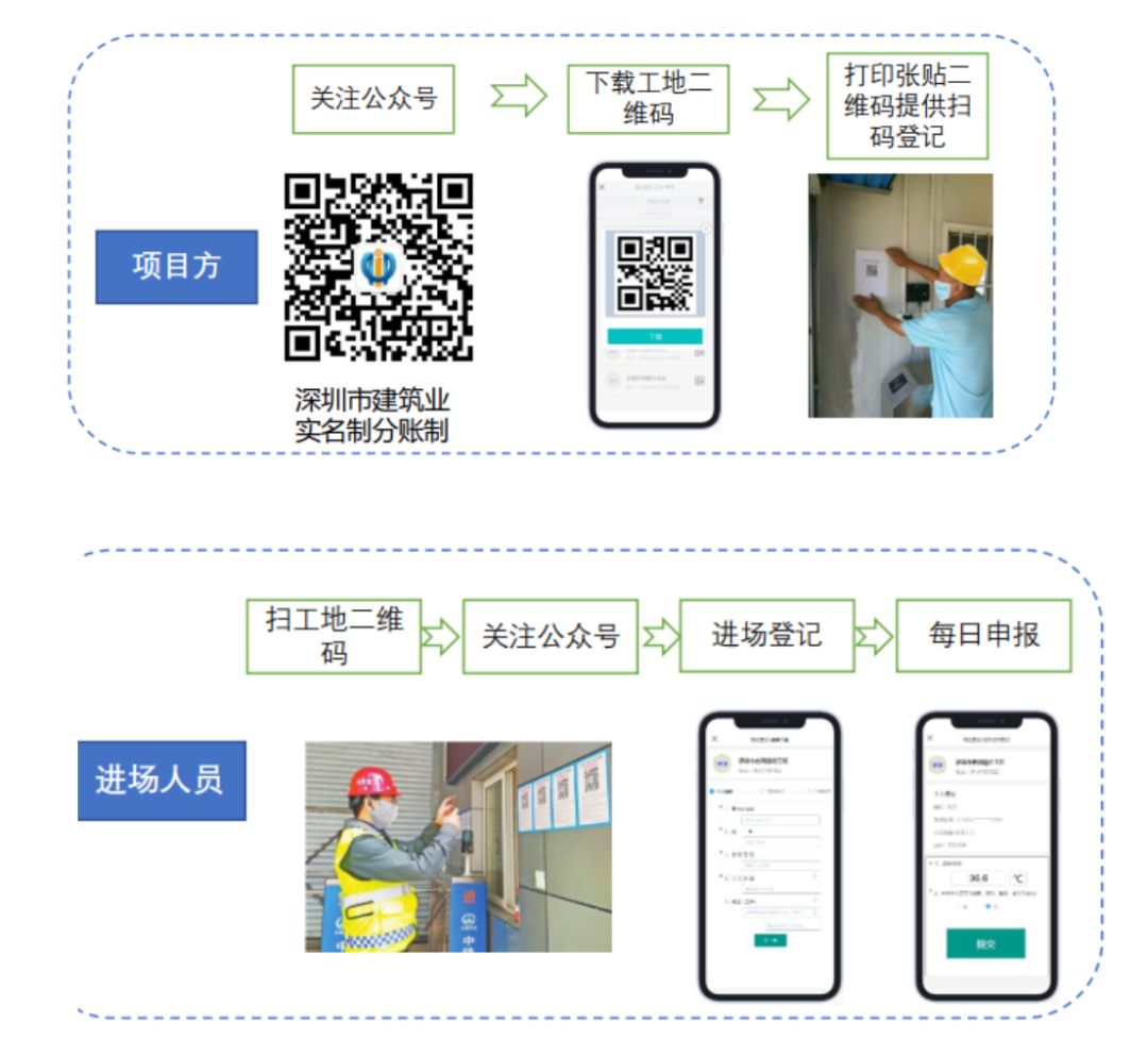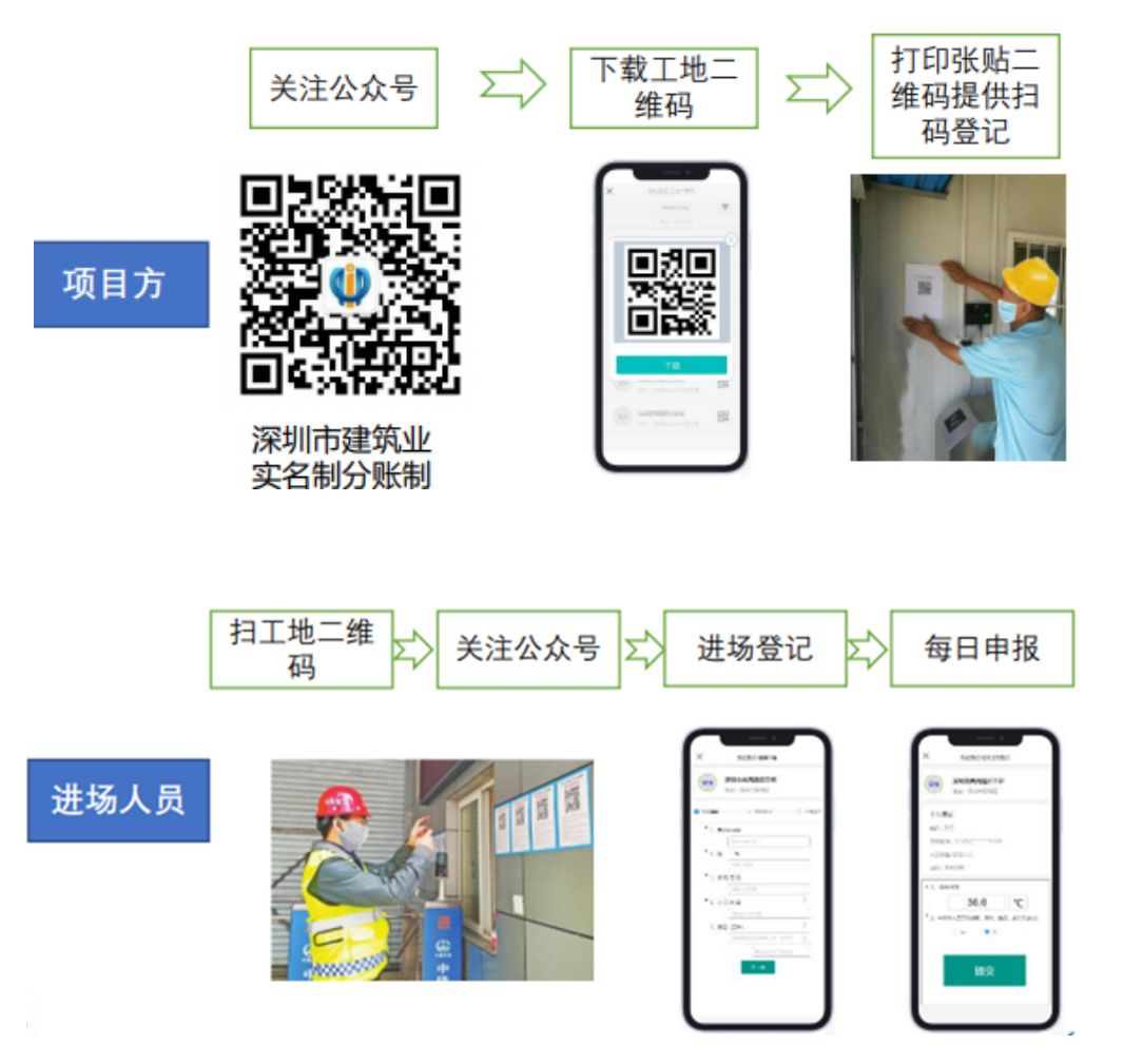 市場建設(shè)單位應(yīng)關(guān)注深圳市建筑業(yè)實名制分賬制微信公眾號,獲取本工地的微信二維碼,并將工地二維碼張貼至工地公示區(qū)域。施工人員每日進(jìn)場前測溫后,掃碼申報個人測溫結(jié)果和健康狀況。