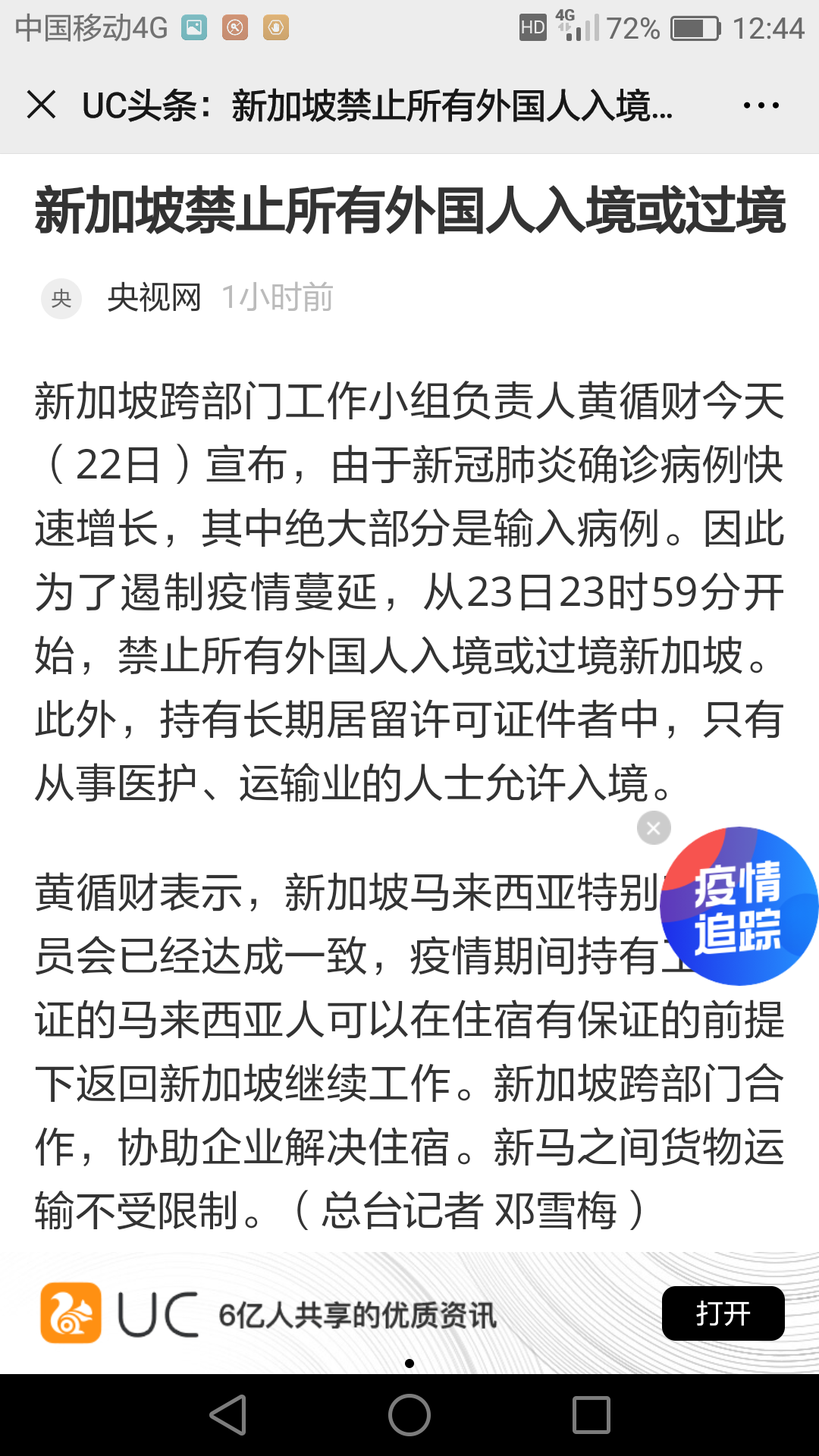 今日早些時候,據(jù)央視網(wǎng)報道,新加坡跨部門工作小組負(fù)責(zé)人宣布,為遏制疫情蔓延,從23日23時59分開始,禁止所有外國人入境或過境新加坡。同時,持有長期居留許可證件者中,也只有從事醫(yī)護(hù)、運(yùn)輸業(yè)的人士允許入境。(記者蔡良煥)