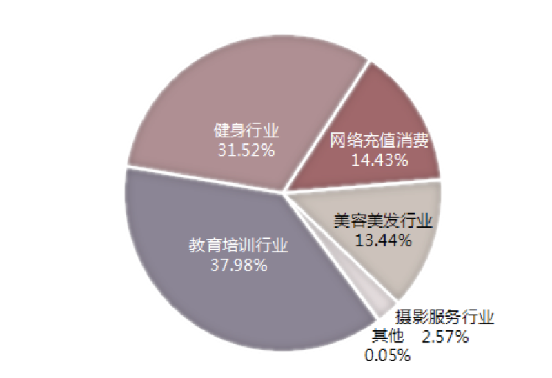 而有關(guān)預付式消費(不含共享出行企業(yè))的投訴有23829宗,占全年投訴量的10.81%。涉及多個行業(yè),其中教育培訓行業(yè)預付式消費投訴最多,占比46.74%;其次是美容美發(fā)行業(yè),占比21.31%;第三是文體旅游服務(wù)中的健身行業(yè),占比20.36%。上述三個行業(yè)在2019年投訴量大幅上升,同比增幅超過50%。從投訴內(nèi)容來看,因商家關(guān)門/停止營業(yè)而造成消費者預付金額無法追回問題最為突出,相關(guān)投訴(不含共享出行企業(yè))占預付式消費(不含共享出行企業(yè))投訴總量的26.25%,共涉及超過1000家企業(yè)。其中,教育培訓行業(yè)最多,占比37.98%;其次是健身行業(yè),占比31.52%;第三是網(wǎng)絡(luò)充值預付式消費,占比14.43%。