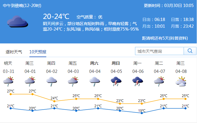 市氣象臺(tái)預(yù)測(cè),31日至4月1日有陣雨或雷陣雨;2-3日多云到陰天,部分時(shí)間有分散小雨;展望清明假期期間,有明顯降雨過(guò)程。注意雨霧天氣低能見度對(duì)交通安全的影響。