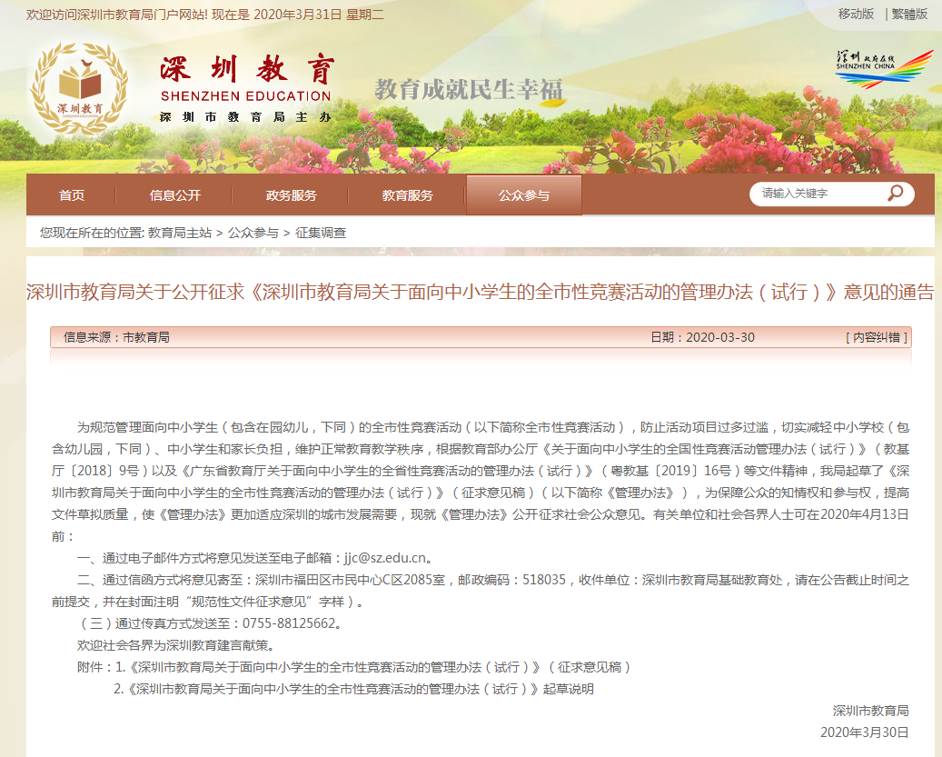 為保障公眾的知情權(quán)和參與權(quán),提高文件草擬質(zhì)量,使《管理辦法》更加適應(yīng)深圳的城市發(fā)展需要,深圳市教育局現(xiàn)就《辦法》公開(kāi)征求社會(huì)公眾意見(jiàn)。有關(guān)單位和社會(huì)各界人士可在2020年4月13日前: