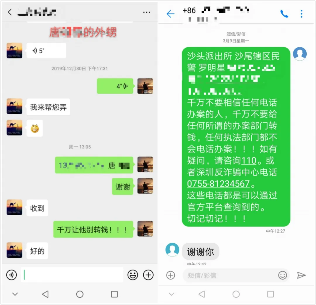 “有些事主被騙子‘洗腦’后,電話里表示相信我們,但是轉(zhuǎn)頭又去給騙子轉(zhuǎn)錢(qián)了。徐女士不在深圳,所以我們?yōu)榱舜_保她真的擺脫騙局,又讓她丈夫給她打電話,還讓房東幫忙撥通視頻通話,我一點(diǎn)點(diǎn)給她講解騙子的詐騙手段,她這才幡然醒悟,沒(méi)有給騙子轉(zhuǎn)錢(qián)?!鼻浼t鈺說(shuō)道。