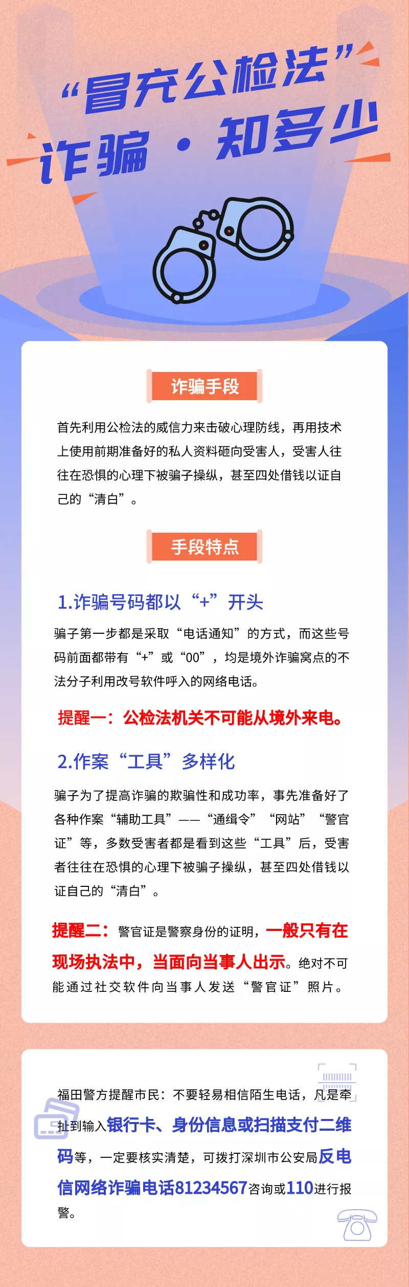 徐女士接到的是冒充公檢法詐騙的電話,騙子經(jīng)常冒充公安、檢察院等執(zhí)法人員,謊稱(chēng)市民身份證辦理了多張銀行卡涉嫌洗錢(qián)或非法集資,給事主扣上涉嫌違法犯罪的帽子,并表示需要轉(zhuǎn)錢(qián)到指定的“安全賬戶”,以此證明自己的清白。