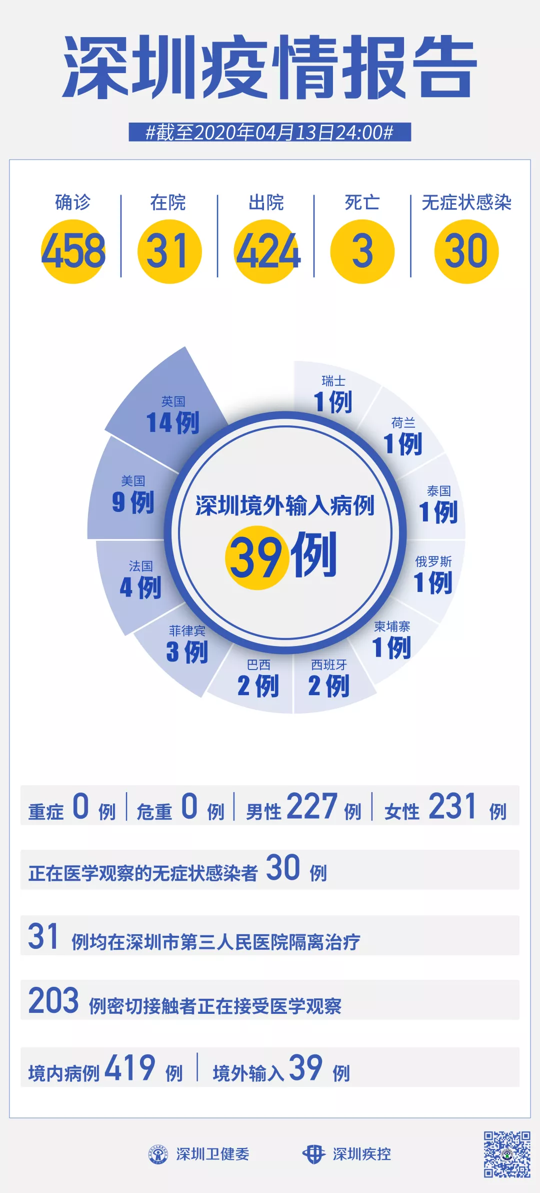 截至4月13日24時(shí),深圳累計(jì)報(bào)告新冠肺炎病例458例。4月13日當(dāng)天新增2例境外輸入病例,新增無(wú)癥狀感染者1例,出院1例。