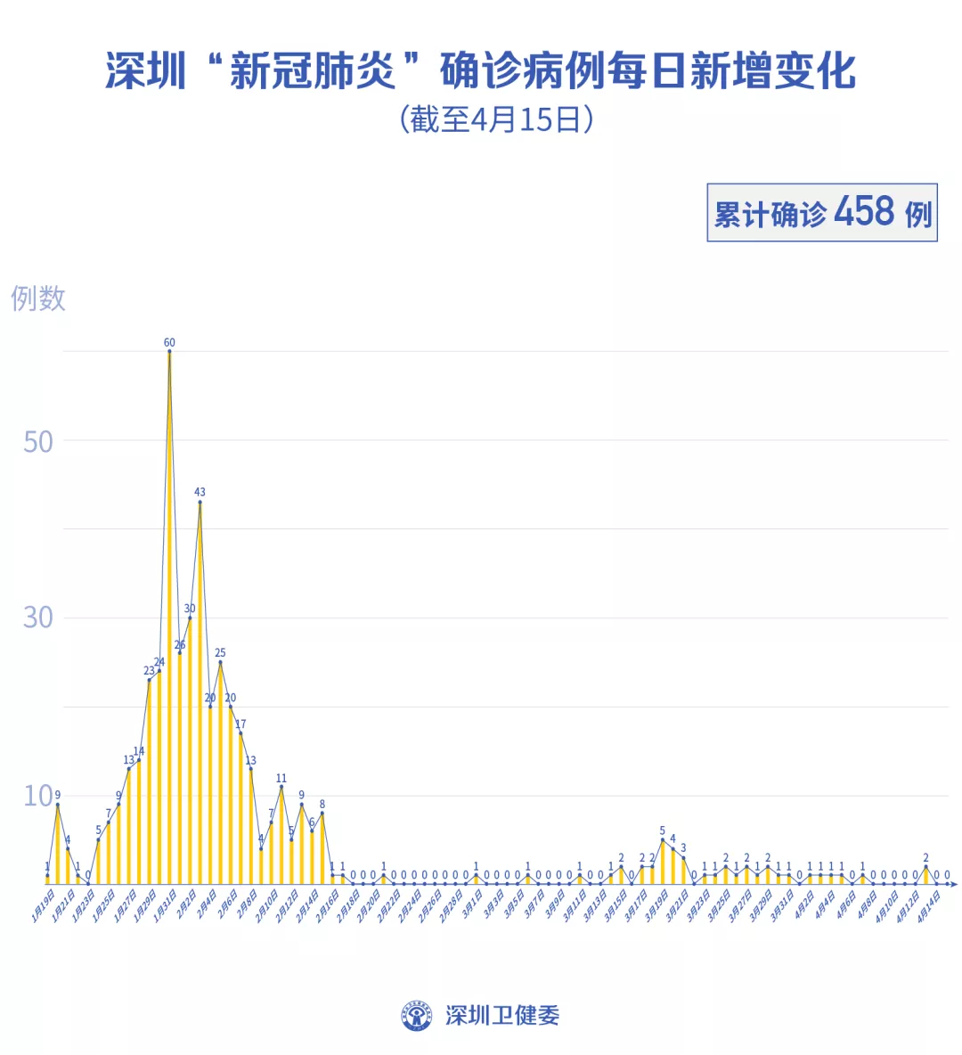 截至4月15日24時(shí),深圳累計(jì)報(bào)告新冠肺炎病例458例。4月15日當(dāng)天新增出院2例。