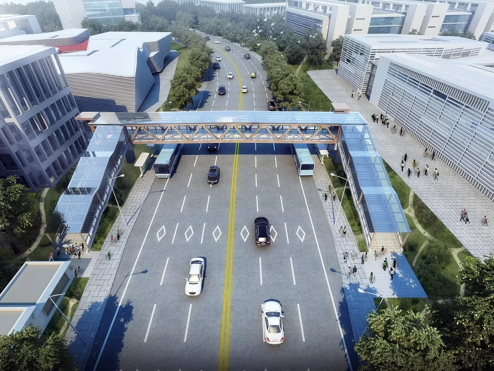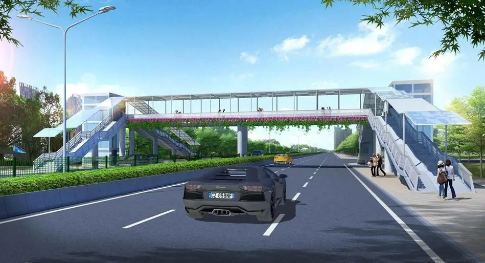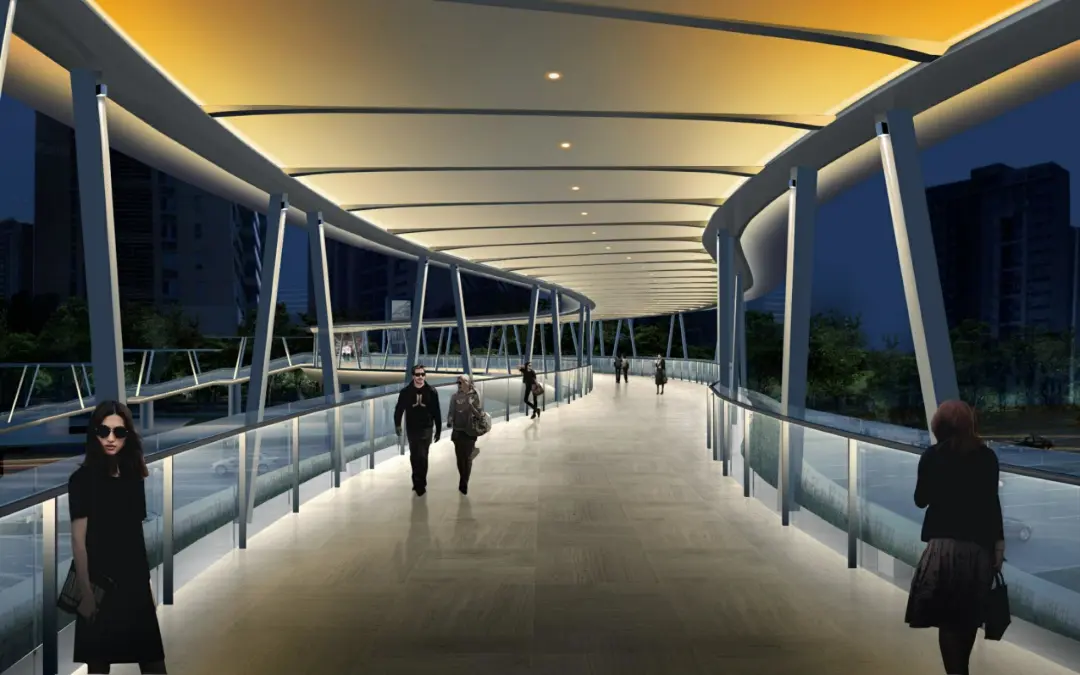 跨越南山區(qū)沙河西路,西接大沖片區(qū),東接沙河西生態(tài)長廊,橋長約113米,橋面凈寬約4.3米,主橋共4跨。天橋設(shè)計(jì)容景觀、造型、燈光、周邊環(huán)境于一體,設(shè)置無障礙觀光電梯,采用鋼箱梁及花崗巖面磚鋪裝、綠化自動滴灌等。天橋的建設(shè)將大大縮短居民繞行時間,對完善周邊居民出行環(huán)境具有重要意義。