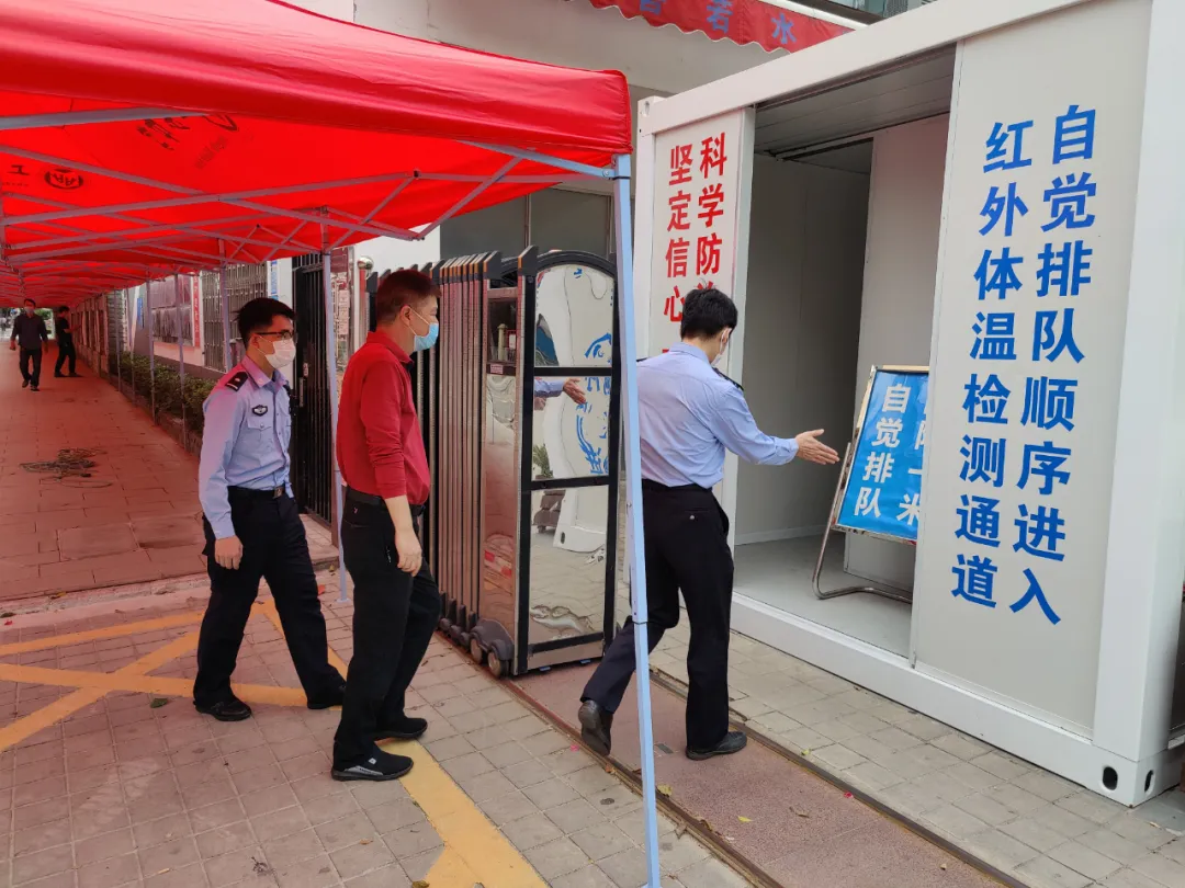 “我們要求社區(qū)民警提前多次進(jìn)校園,對(duì)照分局制定的治安檢查‘菜單’表,認(rèn)真開展地毯式隱患排查,重點(diǎn)檢查一鍵報(bào)警系統(tǒng)、保安員持證上崗、門衛(wèi)值守、來訪登記、應(yīng)急處置等工作落實(shí)情況。”福田公安分局基層基礎(chǔ)大隊(duì)大隊(duì)長羅躍表示,社區(qū)民警主動(dòng)“做預(yù)判、打前站”,聯(lián)合老師、醫(yī)生、安全負(fù)責(zé)人、保安等人員,高標(biāo)準(zhǔn)開展健康檢測(cè)、隔離轉(zhuǎn)運(yùn)、精準(zhǔn)防控等快速處置演練,加強(qiáng)隱患排查,全面做好復(fù)學(xué)前各項(xiàng)準(zhǔn)備工作。