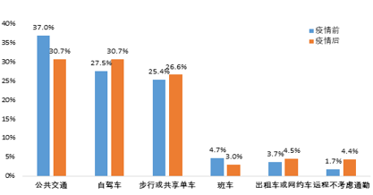 調(diào)查顯示,市民選擇公共交通方式的比例從疫情前的約37%下降至約30%,選擇私人小汽車的從27.5%上升至30.7%,選擇步行、自行車等慢行方式的從25.4%上升至接近27%。疫情過(guò)后,市民出行選擇公共交通的比例有所下降,小汽車和風(fēng)險(xiǎn)更低,更私密、更獨(dú)立的慢行交通方式成為偏好選擇。