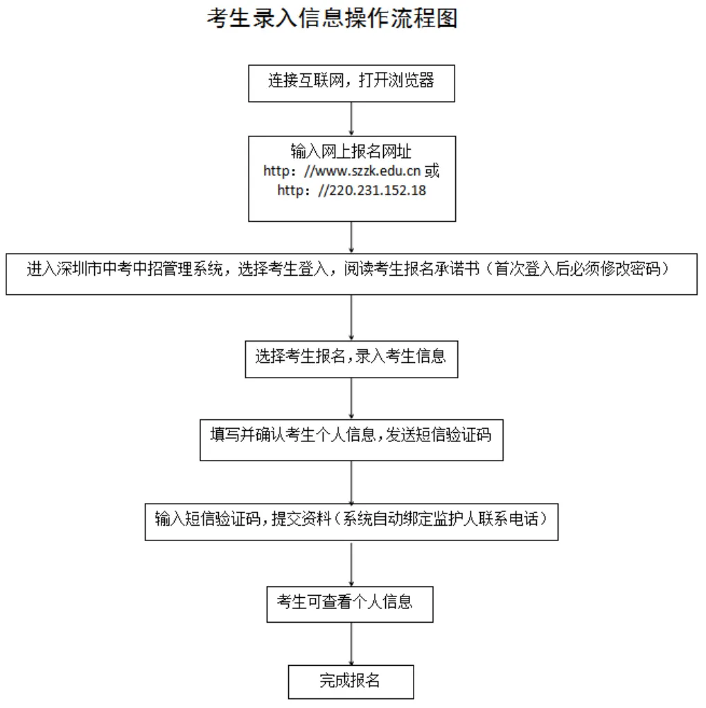 社會類考生采用網(wǎng)上報名方式進行報名。報名考生需在5月6日至15日登錄報名網(wǎng)址(http://www.szzk.edu.cn/),按照提示進行網(wǎng)上注冊,上傳報名審核資料,由考生戶籍所在區(qū)社會報名點進行線上審核,審核通過后系統(tǒng)將生成中考考生號及初始密碼,考生需用獲取的考號及密碼登錄中考中招管理系統(tǒng),填寫個人信息,具體操作可參考“考生錄入信息流程圖”。同時需在報名截止前根據(jù)指引完成網(wǎng)上繳費。