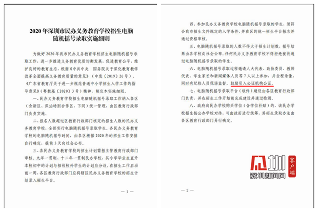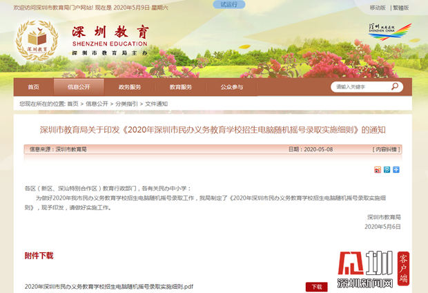 圖為深圳市民辦義務(wù)教育學(xué)校招生電腦隨機搖號錄取實施細則頁面截圖。