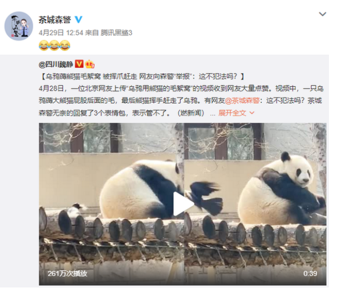 據(jù)說,這是烏鴉第二次薅熊貓毛絮窩了。上一次被薅的,是這只熊貓的媽媽,畫風是這樣的↓↓