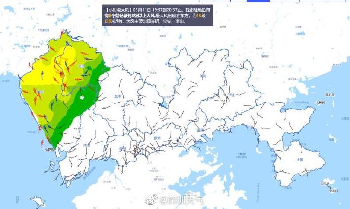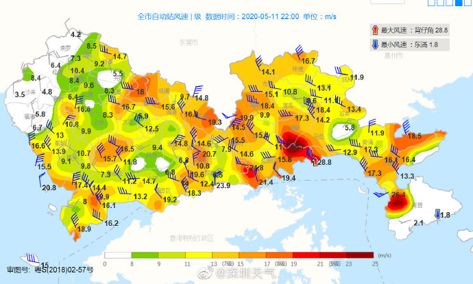 22時18分:過去1小時深圳市最大陣風(fēng)達(dá)到10-11級,出現(xiàn)在鹽田和大鵬南澳地區(qū)。