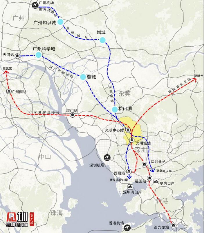 完善產(chǎn)學(xué)研結(jié)合的共享服務(wù)。光明科學(xué)城將建設(shè)產(chǎn)業(yè)服務(wù)中心和產(chǎn)業(yè)創(chuàng)新轉(zhuǎn)化服務(wù)平臺(tái),鼓勵(lì)企業(yè)開放圍墻,增加沿街界面,鼓勵(lì)土地混合利用,提升產(chǎn)城融合水平,增加城市活力,促進(jìn)產(chǎn)業(yè)創(chuàng)新。在交通網(wǎng)絡(luò)方面,光明科學(xué)城依托中深惠城際、深莞城際和城市軌道,加強(qiáng)與深圳寶安國際機(jī)場、廣州白云國際機(jī)場的快速聯(lián)系;依托廣深港客專、深莞城際、深廣中軸城際和城市軌道,加強(qiáng)與香港西九龍口岸、深圳灣口岸、皇崗口岸、福田口岸等的便捷聯(lián)系;加快深廣中軸城際、深莞城際軌道規(guī)劃建設(shè),推動(dòng)深莞城際與深廣中軸城際、中深惠城際、中虎龍城際和莞惠城際的“互聯(lián)互通”。