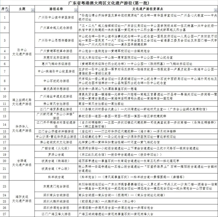 ⑦13日,首批粵港澳大灣區(qū)文化遺產游徑發(fā)布,包含孫中山文化遺產游徑、海上絲綢之路文化遺產游徑、華僑華人文化遺產游徑、古驛道文化遺產游徑和海防史跡文化遺產游徑五大主題共27段實體游徑。其中,海防史跡文化遺產游徑主要分布于東莞、深圳,包括深圳南頭古城游徑、大鵬所城游徑、赤灣炮臺游徑等。