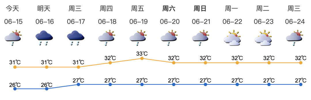 我市多云,有(雷)陣雨,部分時間雨勢較大;氣溫26-31℃;南風3級,陣風6級;相對濕度75%-95%。