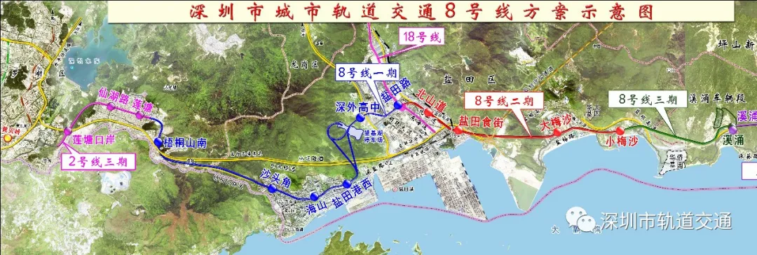 地鐵8號(hào)線一期由2號(hào)線三期蓮塘站站后接出,終點(diǎn)設(shè)于鹽田港后方陸域的鹽田路站,線路長(zhǎng)約12.36km,均采用地下敷設(shè)。線路共設(shè)車站6座,包含蓮塘主所和望基湖停車場(chǎng)。預(yù)計(jì)于今年底開(kāi)通初期運(yùn)營(yíng)。