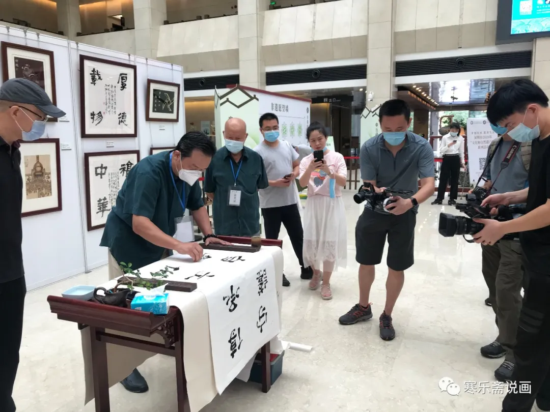 王和平在活動(dòng)現(xiàn)場(chǎng)揮指書寫“傳承文化瑰寶,守護(hù)自然之家”并接受主持人采訪。