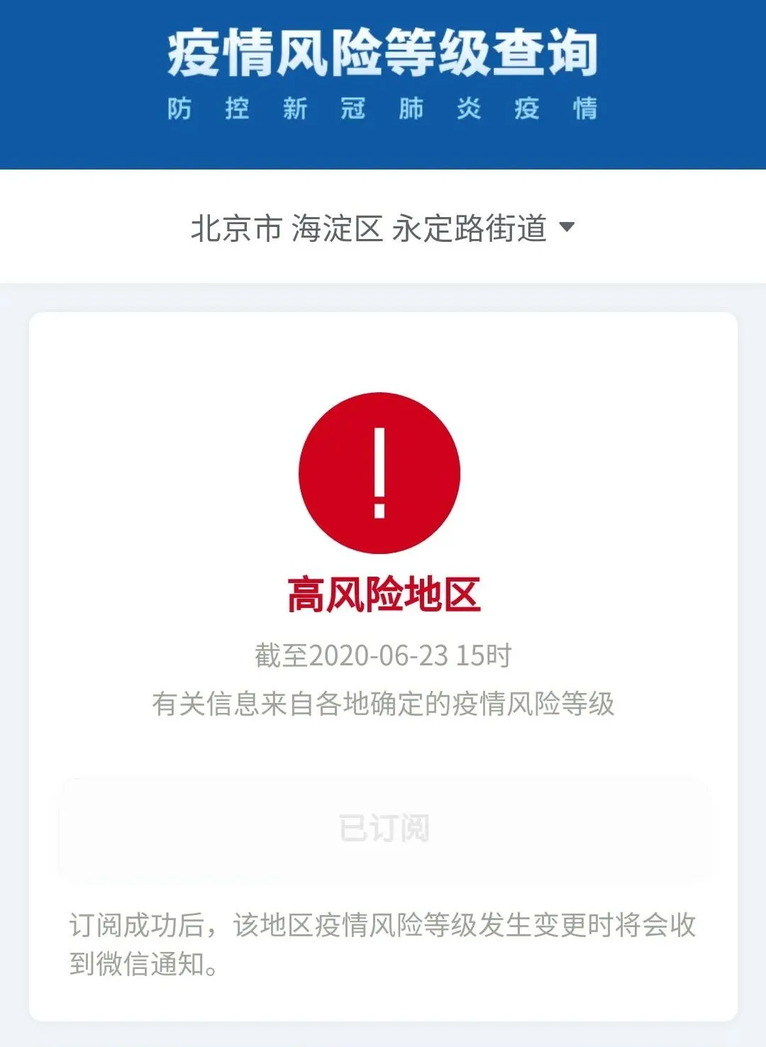 截至6月23日15時,北京市海淀區(qū)永定路街道由中風險調整為高風險。