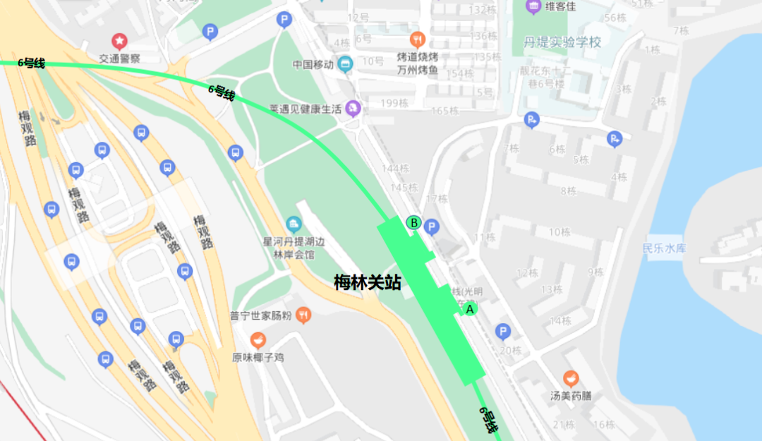 梅林關(guān)站位于梅觀路與豐澤湖小區(qū)之間綠化帶內(nèi),整體與梅觀路平行,呈南北走向。車站南端頭至星河丹堤小區(qū)內(nèi),北端頭至梅林關(guān)檢查站出關(guān)口處,西側(cè)緊靠梅觀路。車站共設(shè)出入口2個(gè):A、B。