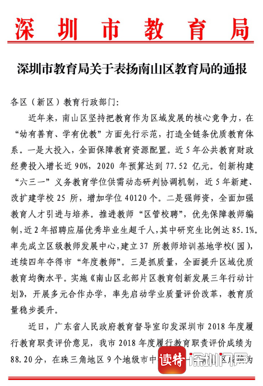 見圳客戶端·深圳新聞網(wǎng)2020年7月1日訊(深圳特區(qū)報記者 李麗)6月30日,《深圳市教育局關于表揚南山區(qū)教育局的通報》在全市教育界引起關注。通報表示,近日,廣東省人民政府教育督導室印發(fā)深圳市2018年度履行教育職責評價意見,深圳2018年度履行教育職責評價成績?yōu)?8.20分,在珠三角地區(qū)9個地級市中排名第一,其中,南山區(qū)成績?yōu)?8.64分,在珠三角地區(qū)48個縣(市、區(qū))中排名第一。經(jīng)研究,決定在全市教育系統(tǒng)對南山區(qū)教育局給予通報表揚,并希望南山區(qū)教育局率先建成全國義務教育優(yōu)質均衡發(fā)展區(qū)。