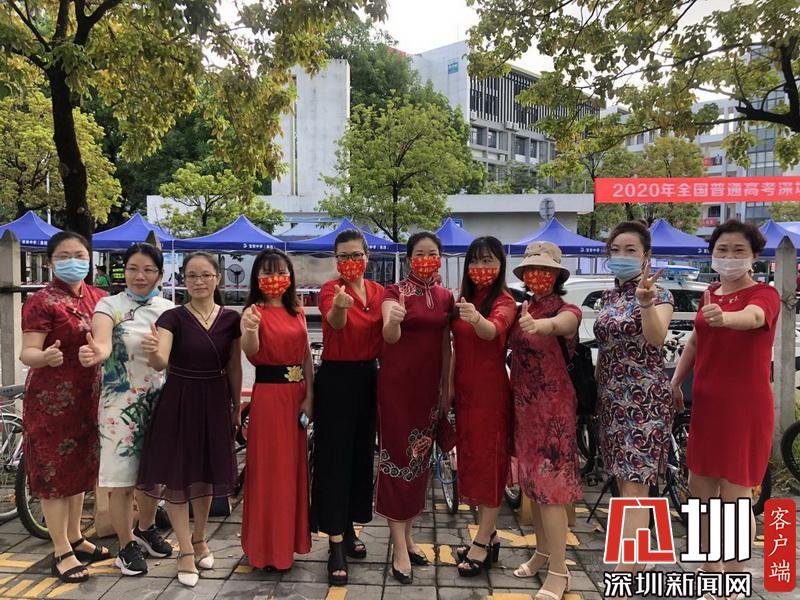 “以夢為馬,不負韶華,旗開得勝,馬到成功?!睂W生家長們身穿旗袍為孩子吶喊助威。