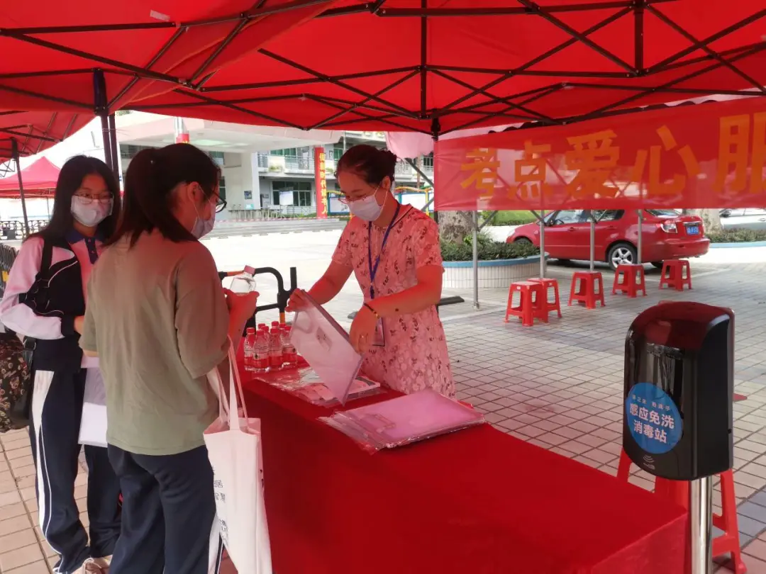 在現(xiàn)場,學校設(shè)有考點愛心服務(wù)站,為學生提供文件袋、口罩、礦泉水等物品。學校老師對前來領(lǐng)物資的學生說:“加油,祝你們考試順利!”