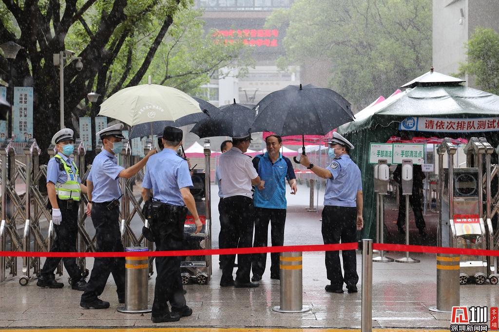 上午11時,深圳部分地區(qū)下起陣雨,交警在考點外了解現場情況。