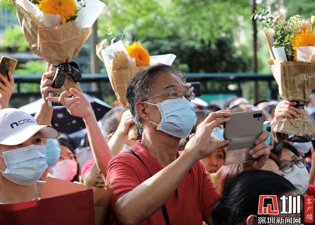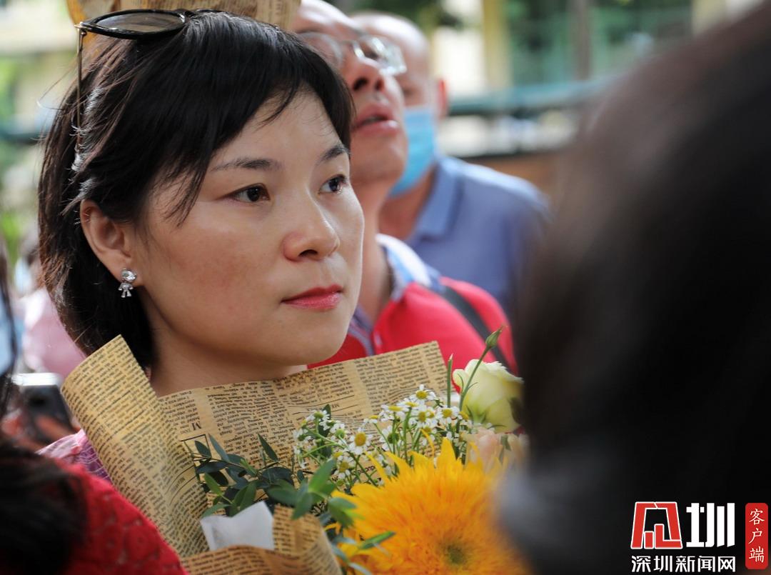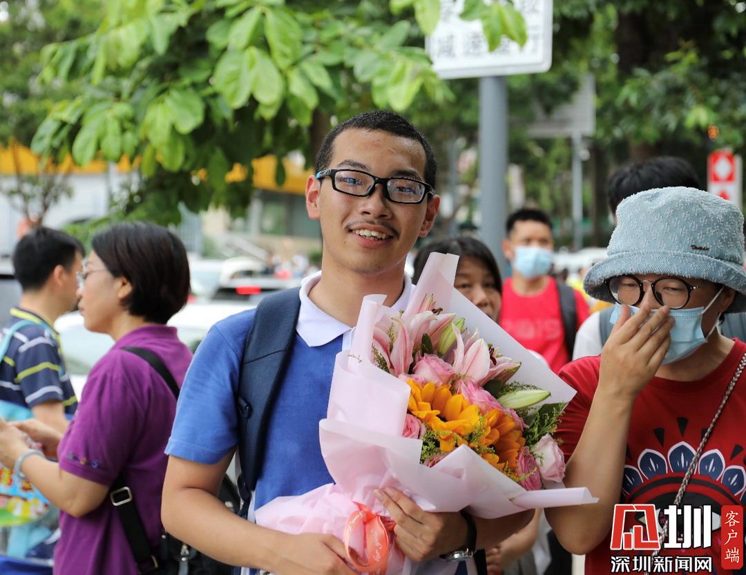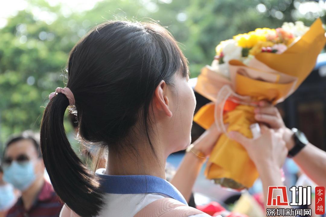 深圳高級中學(xué)考點外家長受捧鮮花、滿懷期待。