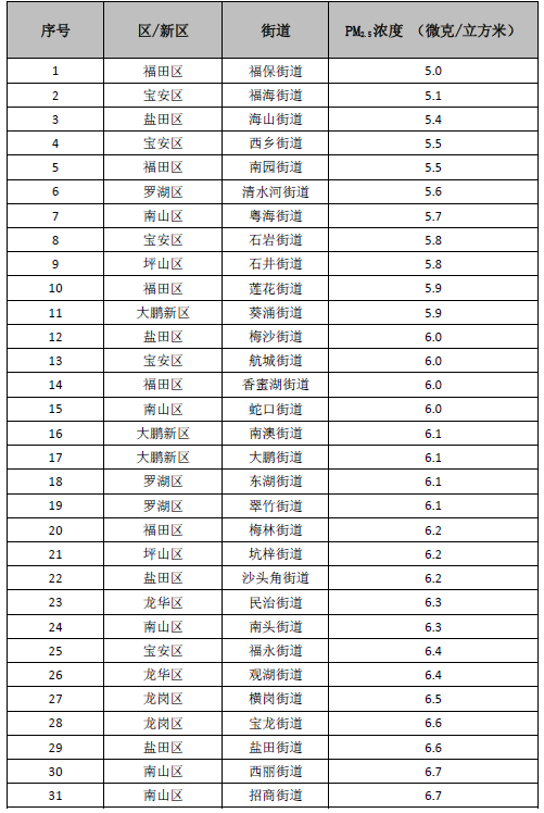 排名前十的街道是:福保街道、福海街道、海山街道、西鄉(xiāng)街道、南園街道、清水河街道、粵海街道、石巖街道、石井街道和蓮花街道;排名倒數(shù)后十的是:觀瀾街道、坪地街道、龍?zhí)锝值馈⒋罄私值?、馬田街道、公明街道、龍崗街道、龍華街道、沙井街道和鳳凰街道。