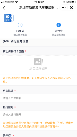 客戶需上傳銀行卡照片,并填寫銀行賬號(hào)、開戶行信息。開戶行如不在選項(xiàng)范圍內(nèi)可選擇“其他”自填。其中,銀行賬號(hào)需為深圳市營(yíng)業(yè)網(wǎng)點(diǎn)開戶的銀行一類儲(chǔ)蓄卡,華僑、港澳臺(tái)地區(qū)居民及外國人需提供深圳市建設(shè)銀行一類儲(chǔ)蓄卡。