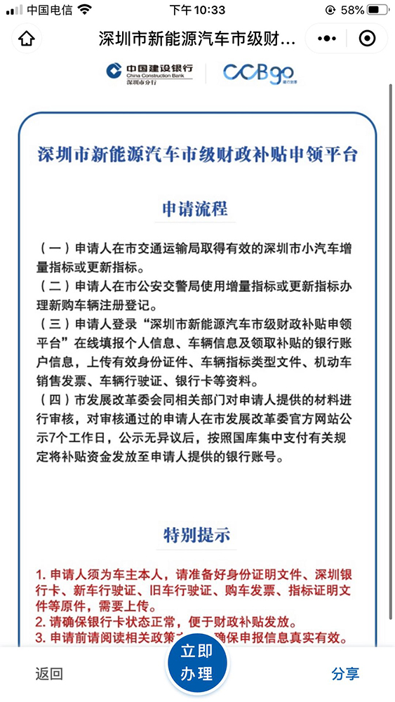 客戶進(jìn)入平臺(tái)后,可查詢平臺(tái)申請(qǐng)流程、注意事項(xiàng)。點(diǎn)擊“立即辦理”后,可進(jìn)一步在線閱讀《深圳市應(yīng)對(duì)新冠肺炎疫情影響促進(jìn)新能源汽車推廣應(yīng)用若干措施》、《深圳市應(yīng)對(duì)新冠肺炎疫情影響促進(jìn)新能源汽車推廣應(yīng)用若干措施財(cái)政補(bǔ)貼申領(lǐng)工作指引》等政府相關(guān)政策文件。