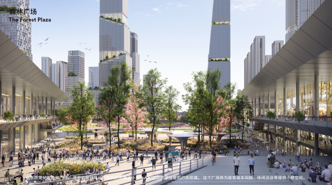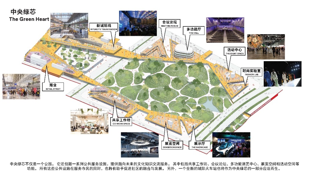 方案以獨(dú)特的“綠鏈都芯”為理念,打造一個(gè)耦合生態(tài)、交通和公共生活的超級(jí)樞紐。設(shè)計(jì)的中央綠芯引入大面積森林和草甸,使人們?cè)诔鞘兄兄赜鲎匀?,讓北站樞紐地區(qū)既擁有大城市商務(wù)中心區(qū)的特質(zhì),也擁有郊外自然的品質(zhì),形成全新的都市生活體驗(yàn)。同時(shí),中央綠芯還包括會(huì)議論壇、多功能演藝中心等一系列公共服務(wù)設(shè)施,提供面向未來的文化知識(shí)交流服務(wù)。
