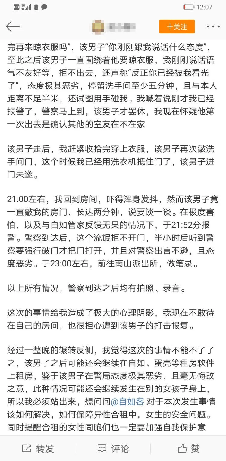 7月14日,梁女士在新浪微博發(fā)帖稱,她是南山某小區(qū)的自如租客,其在7月13日21時許的洗澡過程中,遭遇男性室友屢次闖入。根據(jù)梁女士描述,該男子態(tài)度惡劣,在梁女士未著寸縷的情況下在浴室停留時間長達數(shù)分鐘,其間還試圖伸手觸碰梁女士。梁女士回到房間后,向自如管家進行反饋并報警。