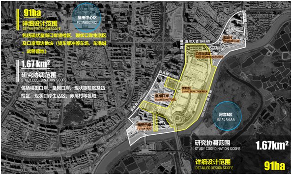 競(jìng)賽由深圳市投資控股有限公司主辦,深港科技創(chuàng)新合作區(qū)發(fā)展有限公司承辦,深圳市規(guī)劃和自然資源局、深圳市建筑工務(wù)署、福田區(qū)人民政府為技術(shù)指導(dǎo)單位,旨在落實(shí)關(guān)于皇崗口岸片區(qū)遴選國(guó)際一流設(shè)計(jì)師進(jìn)行整體設(shè)計(jì)、統(tǒng)一開發(fā)、連片建造的要求,通過(guò)“定向邀請(qǐng)5家+資格預(yù)審10家”的方式,遴選了15家國(guó)際知名設(shè)計(jì)機(jī)構(gòu)參賽。其中,詳細(xì)設(shè)計(jì)范圍包括現(xiàn)狀皇崗口岸貨檢區(qū)、口岸生活區(qū)及口岸周邊地塊,面積約0.91平方公里;研究協(xié)調(diào)范圍為河套C區(qū),包括詳細(xì)設(shè)計(jì)范圍及周邊的福田口岸、赤尾村等區(qū)域,面積1.67平方公里。