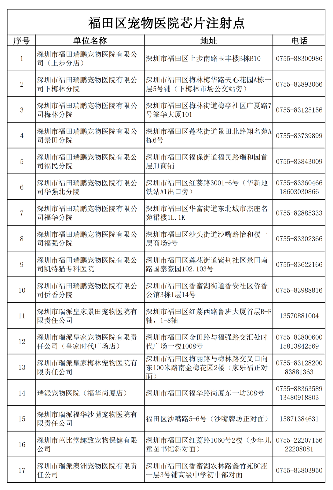 據(jù)福田區(qū)城市管理和綜合執(zhí)法局市容管理科副科長(zhǎng)羅偉介紹,犬只芯片植入工作目前已在深圳市福田瑞鵬寵物醫(yī)院梅林分院、瑞派皇家寵物醫(yī)院時(shí)代廣場(chǎng)店完成試點(diǎn),隨后將在全區(qū)33個(gè)寵物醫(yī)院陸續(xù)開(kāi)放芯片植入工作。