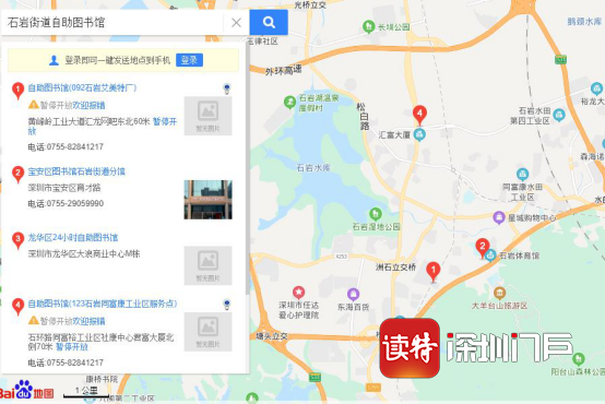 28日上午,記者通過登錄深圳圖書館街區(qū)自助圖書館查詢發(fā)現(xiàn),目前寶安區(qū)可以預(yù)借取書的公共服務(wù)點(diǎn)共有25個(gè),其中石巖街道無服務(wù)點(diǎn)。而通過百度搜索,之前設(shè)置的石巖艾美特廠服務(wù)點(diǎn)和同富康工業(yè)區(qū)服務(wù)點(diǎn)顯示暫停開放。