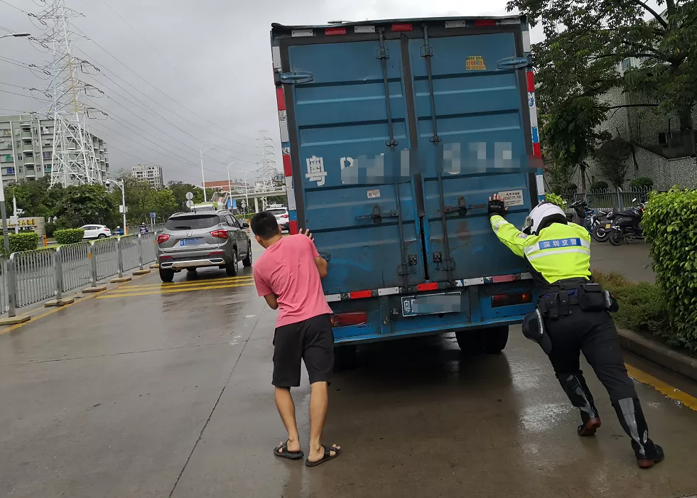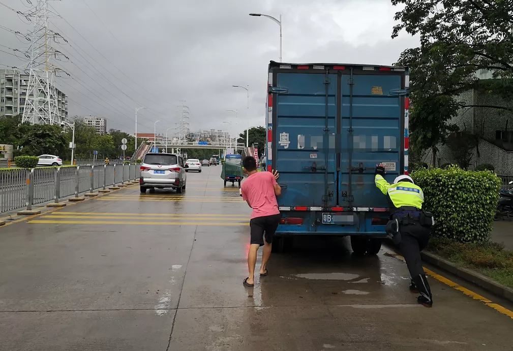 了解情況后,為緩解路面擁堵,避免產生交通事故,鐵騎隊員協(xié)助司機把車推到一邊等待救援。
