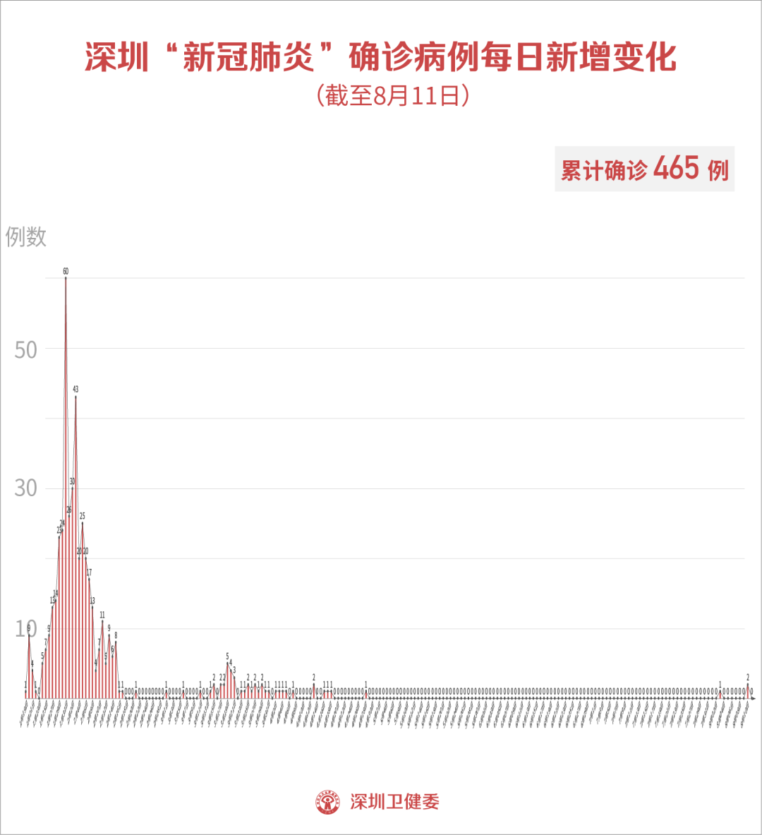 截至8月11日24時,深圳市累計報告新冠肺炎確診病例465例。目前在院3例。