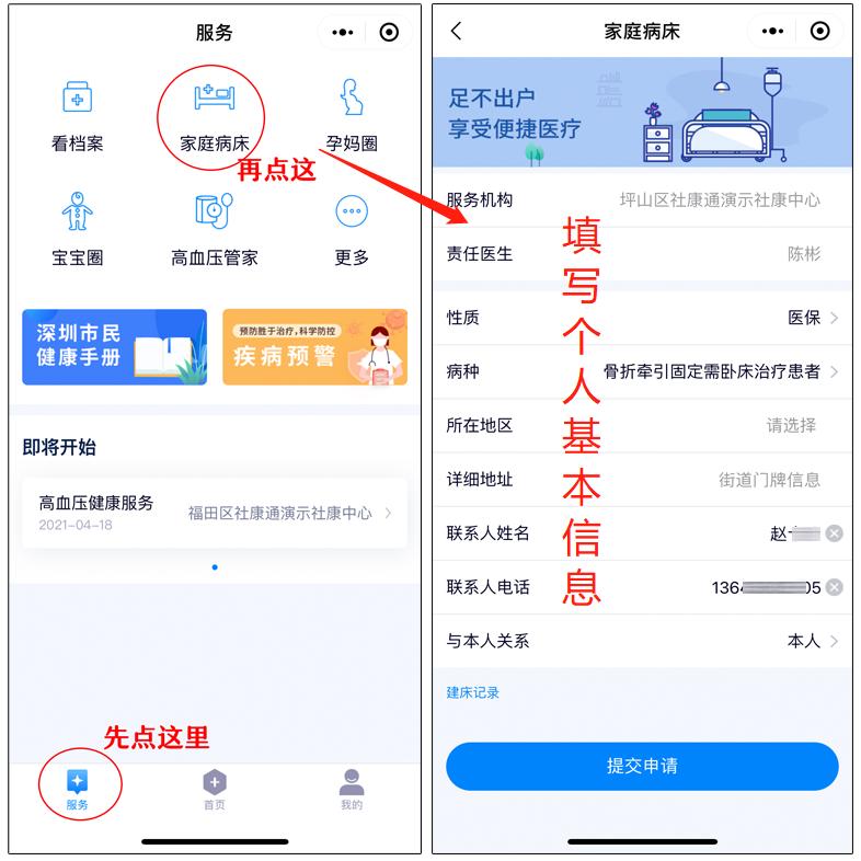 居民向家庭病床服務(wù)機構(gòu)提出申請,填寫家庭病床申請表,并提供就診記錄、住院小結(jié)、相關(guān)輔助檢查及影像報告、用藥清單等病歷資料。